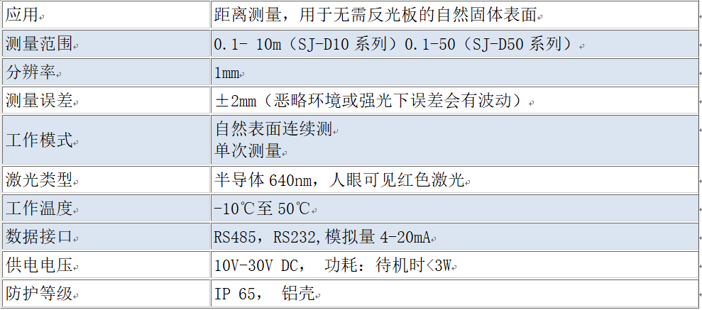 SJ-D系列工业级激光传感器,是通过激光往返目标的时间差或相位差计算距离的设备。采用相位比较原理进行测量。激光传感器发射不同频率的可见激光束,接收从被测物返回的散射激光,将接收到的激光信号与参考信号进行比较,然后用微处理器计算出相应相位偏移所对应的物体间距离,以达到mm级测量精度。激光传感器工作时,先由激光发射二极管对准目标发射激光脉冲。经目标反射后激光向各方向散射。部分散射光返回到传感器接收器,被光学系统接收后成像到雪崩光电二极管上。雪崩光电二极管是一种内部具有放大功能的光学传感器,因此它能检测极其微弱的光信号,并将其转化为相应的电信号。
